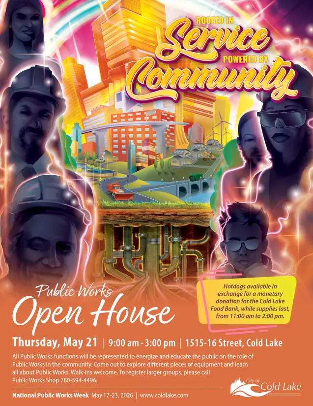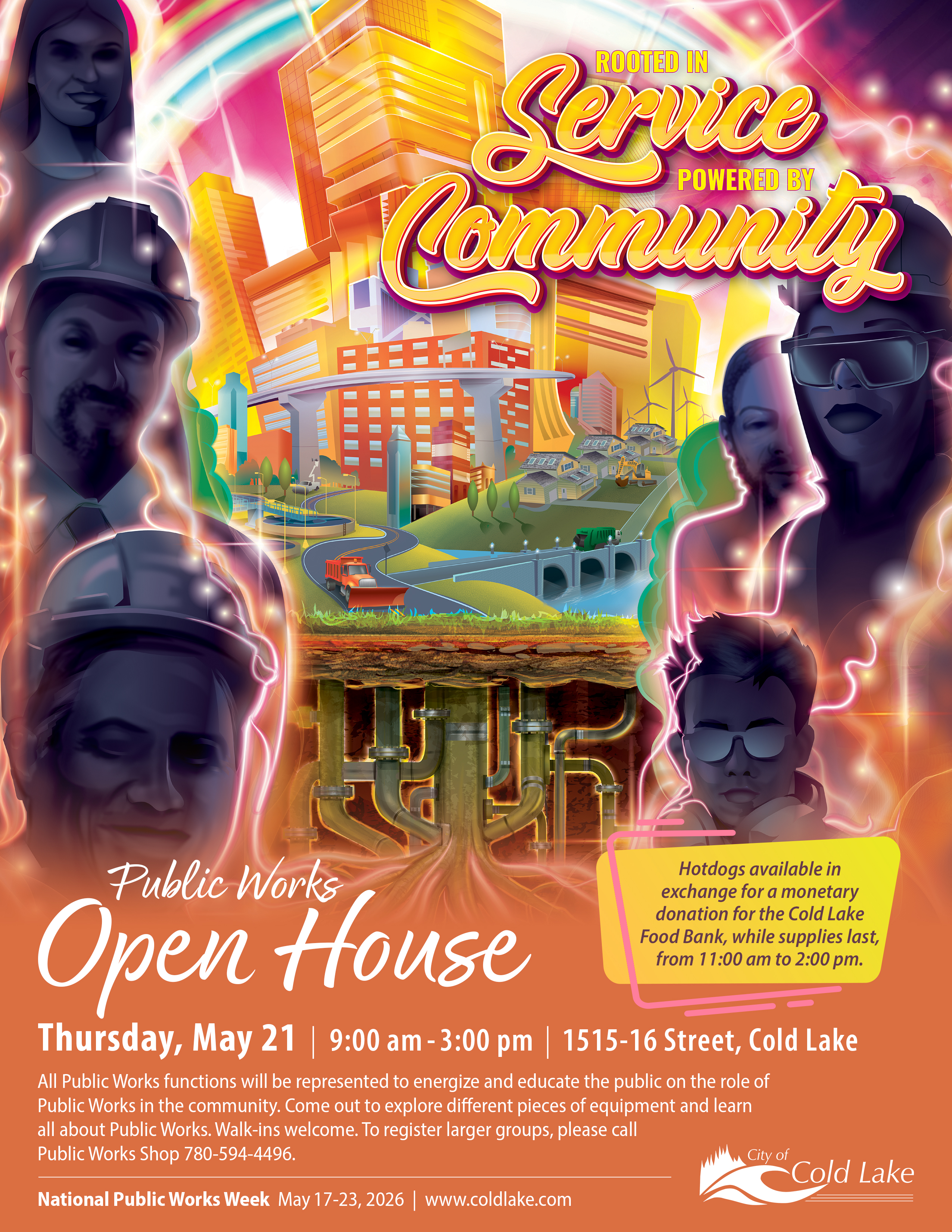 Come join the City's Public Work's department and see how the hardest working employees in Cold Lake keep our City running from day to day. Talk to our workers and get a hands-on view of the equipment they use every day at the Cold Lake Public Works shop.