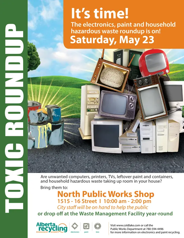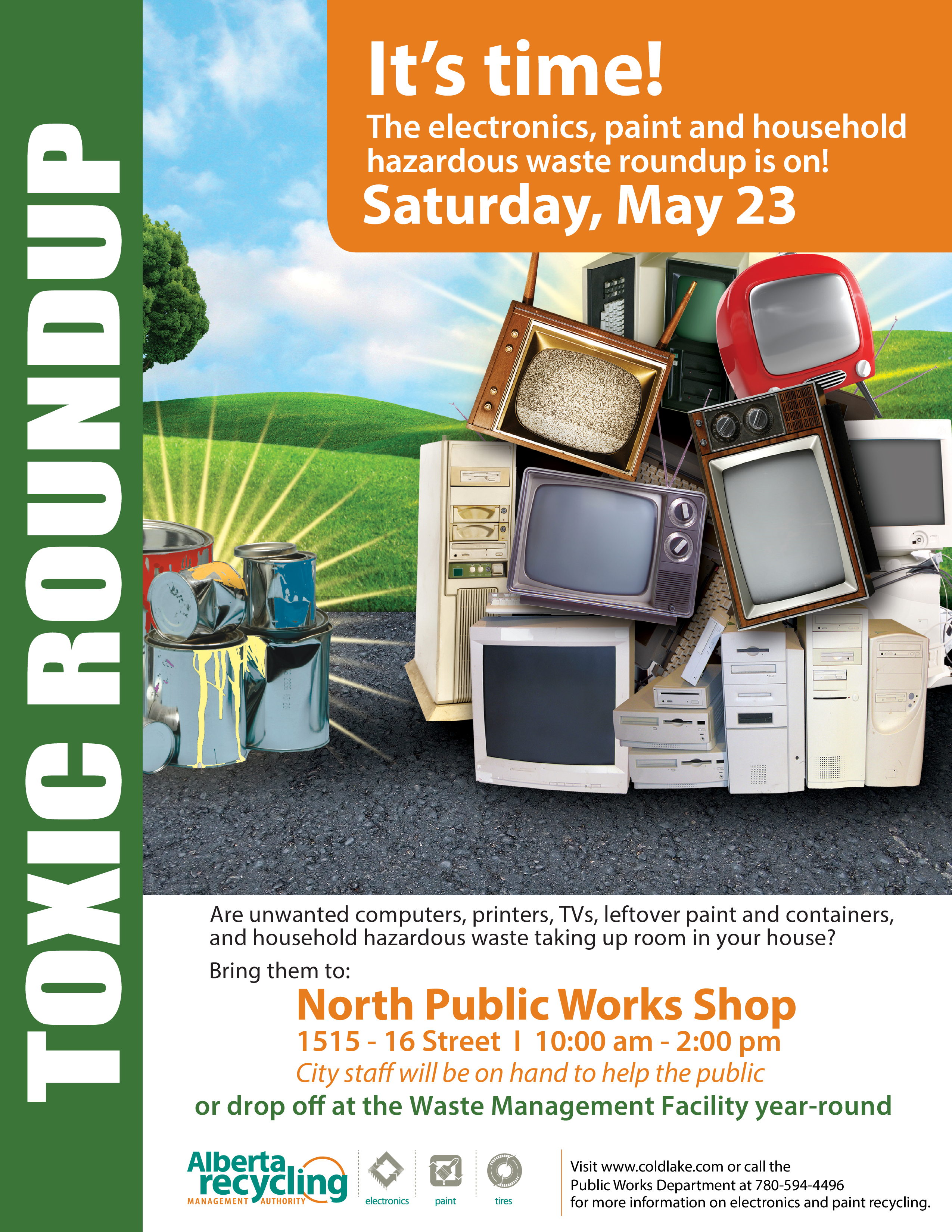 Bring all of your hazardous waste to the Cold Lake Public Works Shop and staff will be on hand to assist you with disposal. If you are unable to make it on May 23, you can drop off your waste at our Transfer Station's Waste Management Facility year round.