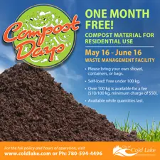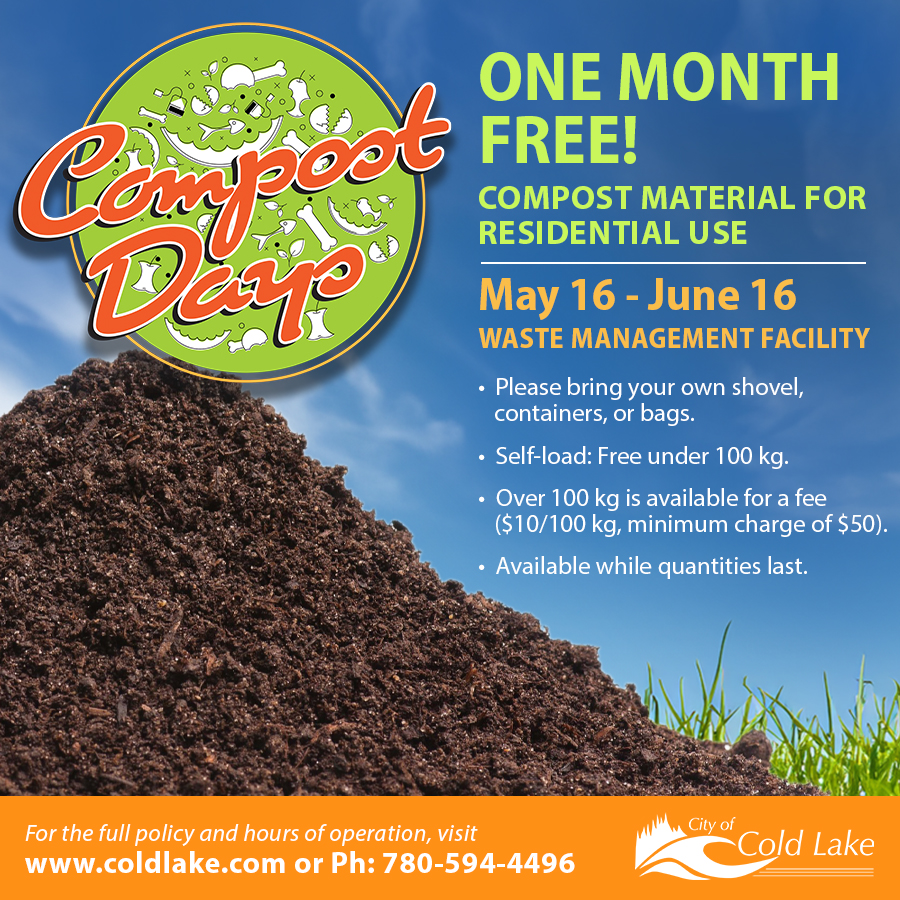 To help you get your spring gardening started, the City will once again be offering free compost material, available for pick up at the Cold Lake Regional Transfer Station. The first 100kg are available for free, with loads above 100 kg available for $10/kg (minimum charge of $50).