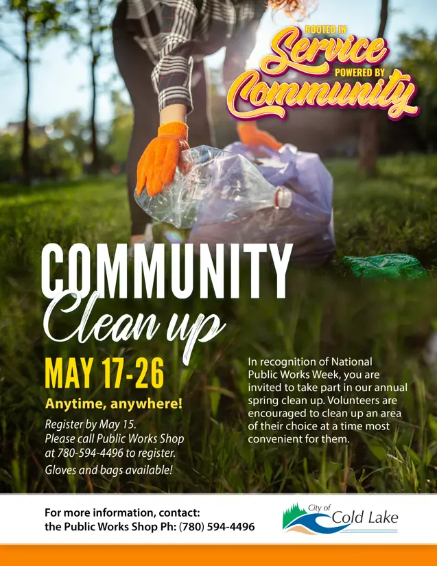 Spring is finally here and the City of Cold Lake needs your help with its spring clean up. During National Pubilc Works Week, residents are encouraged to lend a hand and clean up your neighbourhood, local park or any area of the City that is special to you! Register with Public Works before May 15. The City can also provide garbage bags and gloves to help you get started.