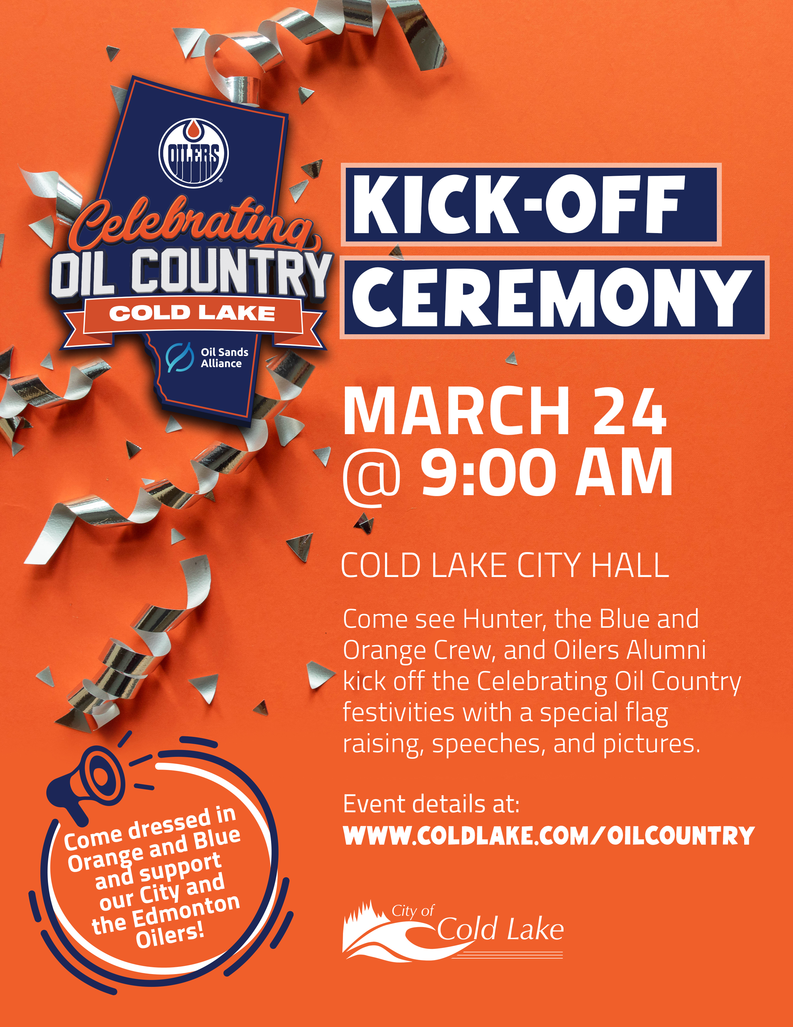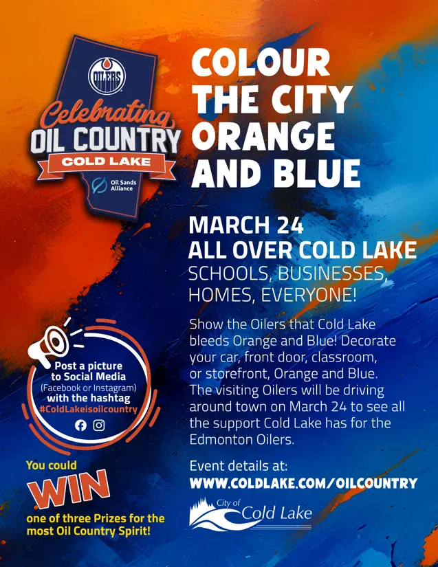 - Let your Oilers team spirit show by decorating your storefront, business, office or front door with Orange and Blue. Share photos of your decorations with the hashtag #ColdLakeisOilCountry and our guests will select their favorites to win some cool Oilers gear!